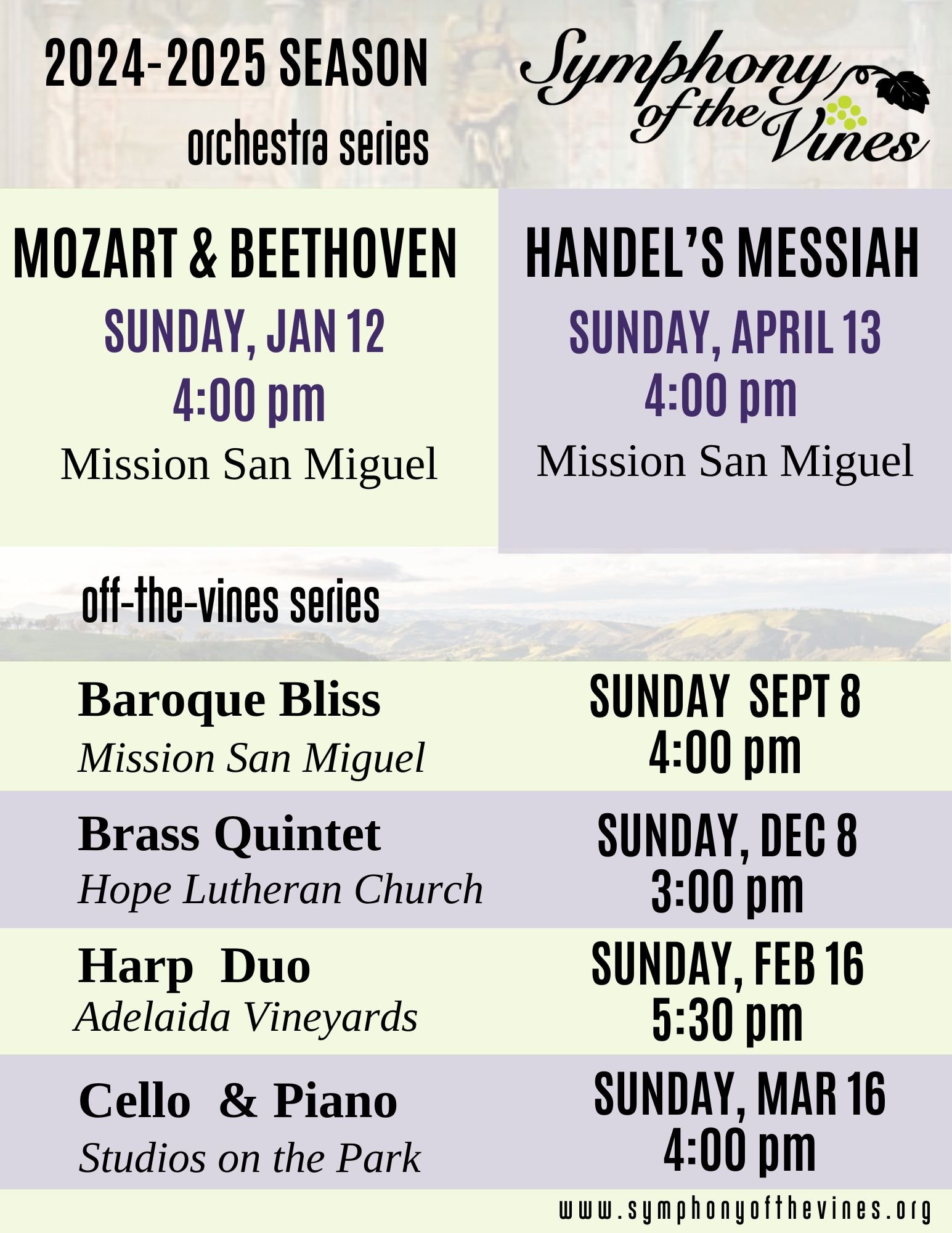 Symphony of the Vines is excited to present our 2024-25 season of orchestra and chamber music concerts. We hope you will join us for many of these events. The orchestra series will feature performances of Mozart’s beautiful Clarinet Concerto, Beethoven’s powerful Symphony No. 4, and a complete performance of Handel’s glorious oratorio “Messiah." The Off-The-Vines chamber series will feature baroque arias and trio sonatas, a holiday brass quintet, and lovely chamber music for harp.